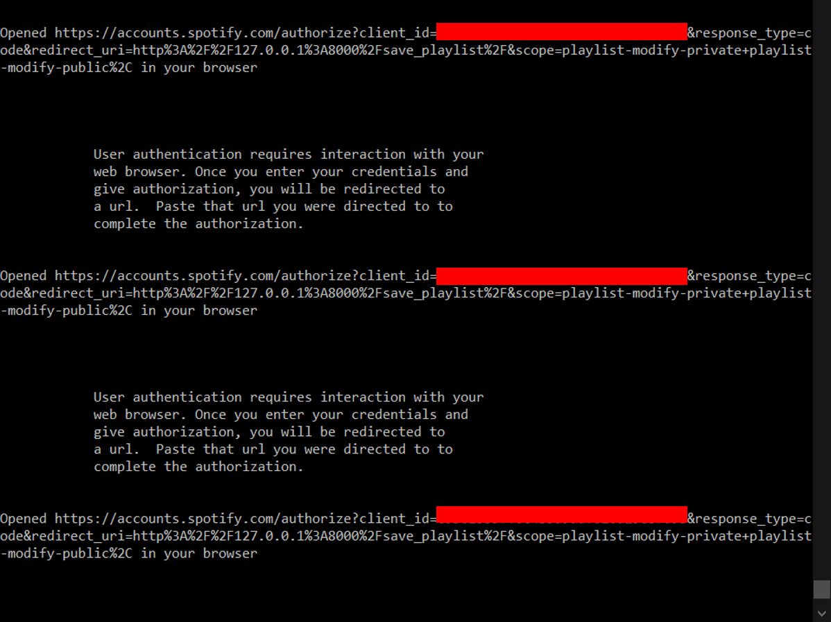 return render(request, 'blog/save_playlist.html', {'playlist_id':playlist_id})当用户向Spotify输入用户名和登录时,多个窗口不断弹出,而不仅仅是一个窗口(参见下面的终端)。我相信问题在某种程度上是在获得令牌。