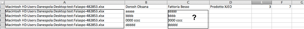 有一个微小的错误,但我仍然不希望它出现。这是单个生成记录的屏幕截图。您可以在ColA中看到文件的路径,在B列中可以看到用户数据(姓名、姓氏、地址等),而其他列(C、D、E、F等)则有特定的数据。现在,首先,我不知道为什么对许多行重复路径,这些行数等于B列所用的行总数,最重要的是,我不知道为什么B列的数据也被部分复制到C列中。