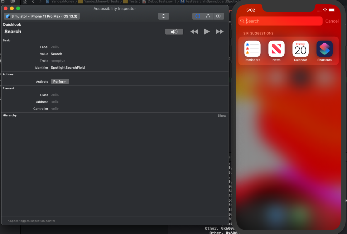 spotlightSearchField.typeText("Some text")无法找到具有可访问性标识符SpotlightSearchField的元素,尽管Spotlight搜索面板是可见的。如果我调用debugDescription,元素树中也不存在。DebugDescription输出不包含任何带有聚光灯和siri建议的下拉面板元素--仅包含主屏幕元素。
