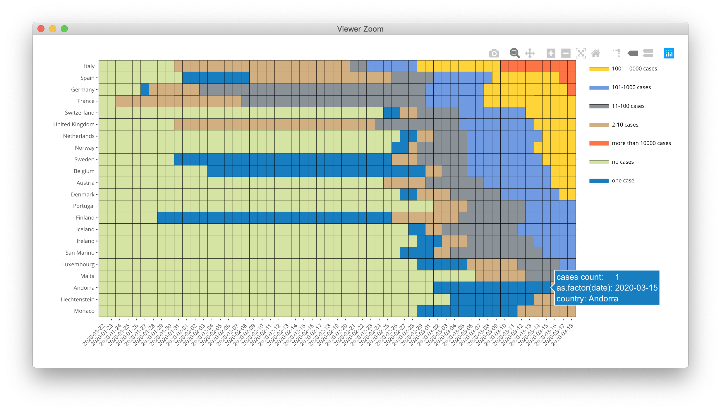 我正在构建一个R中的交互式时间序列热图,它使用的是透明和闪亮的功能。作为这个过程的一部分,我重新编码了从连续格式到序号格式的热图值,所以我有一个热图,其中六种颜色代表特定的计数类别,而这些类别是从聚合计数值创建的。但是,随着使用ggplotly()创建热图的速度加快,这将导致一个主要的性能问题。我从Plotly跟踪它到tooltip()函数,它呈现交互框。标签数据从我的热图以某种方式超载这个功能,它的执行非常缓慢,即使我只是添加一个标签组件到tooltip()。我正在使用来自Johns Hopkins CSSE储存库的新冠肺炎疫情数据的一个处理子集。下面是一个简化的热图代码,它也使用ggsci