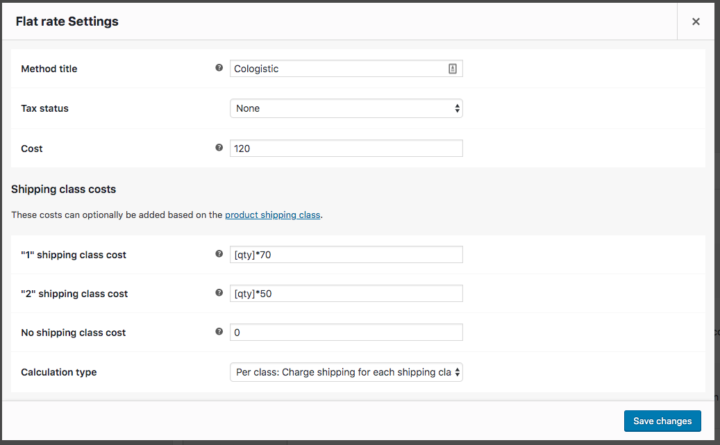 [qty]*70 for shipping-class-1[qty]*50 for shipping-class-2Per class: Charge shipping for each shipping class individually这将工作,并将增加一个金额的成本,切屑类,基于购物车的项目数量。