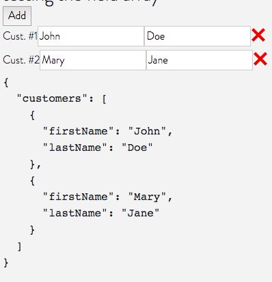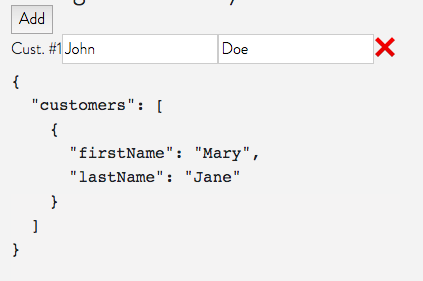 这里我们可以看到,我可以将客户添加到一个列表中,它可以生成一个对象数组。这个很好用。现在,假设我想去掉第一个元素。我点击X,会发生什么?