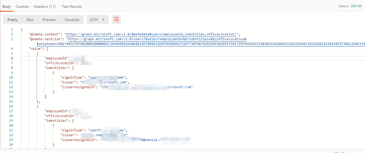 https://graph.microsoft.com/v1.0/users?$select=employeeId ,identities ,officeLocation Response: