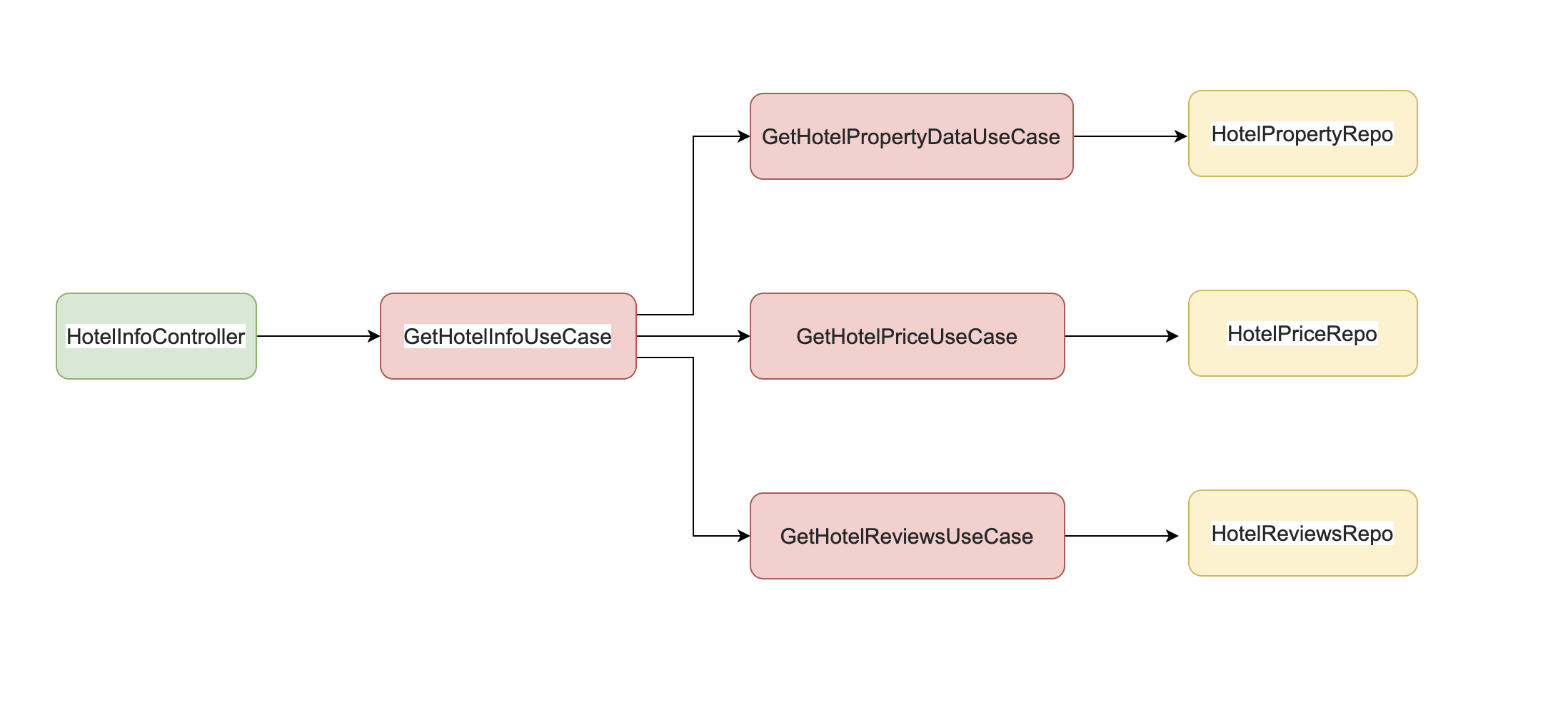 GetHotelPropertyData() (位置、设施…)GetHotelPrice(hotel_id, dates…)GetHotelReviews(hotel_id)一旦所有结果返回,处理并合并数据,并返回包含酒店所有相关数据的1个对象。