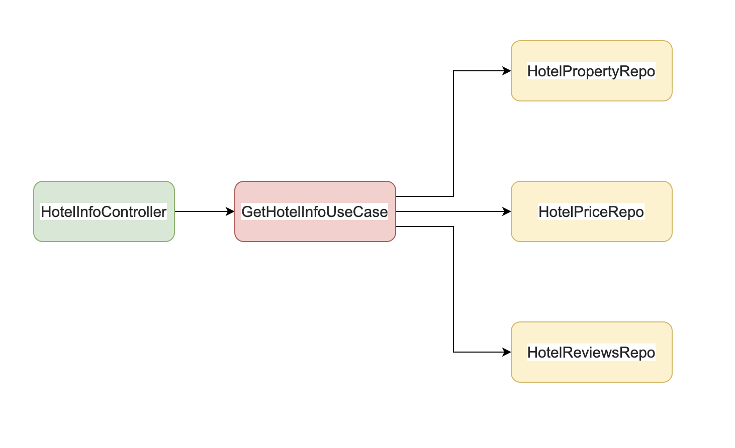 您可以使用该示例来调整您的情况,GetHotelInfo首先在hotel_interactor.go文件中声明,并取决于在hotel_repository中声明的特定业务方法,以及hotel_presenter中定义的响应。