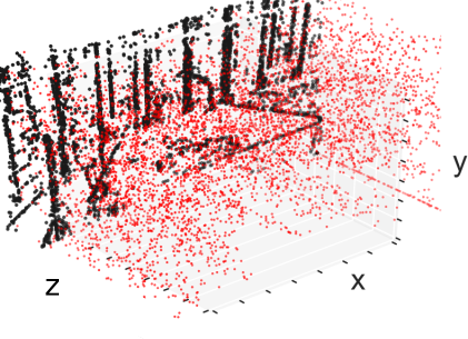 红点是点,黑点是投影到xy平面的红点。虽然在图中它是不可见的,但是每个点也有一个值,当点被移动到xy平面时,这个值被添加到给定的像素中。点由numpy (np)数组表示,如下所示: