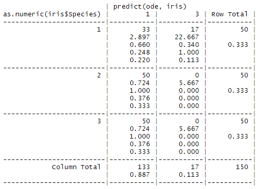 as.numeric(indata$Species)[test] | 1 | 2 | 3 | Row Total |
