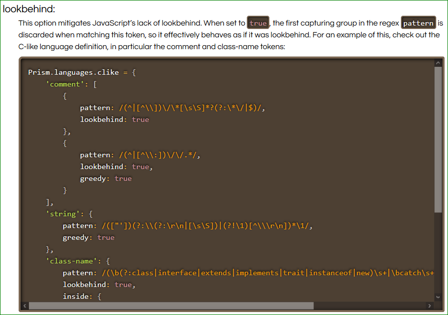 正如@WiktorStribiżew评论中正确地提到的那样:“如果您无法访问一个组,并且没有查找功能,或者\K运算符,您就不能满足您的需要。”但是,通常情况下,如果不太了解Prism --通过它的文档进行搜索--就会让我了解这,在lookbehind选项部分,该部分指出: