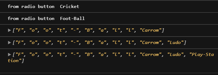 我是新的反应,并作出了一个小游戏组件,其中有indoor和outdoor的选择。在户外项目中,我们有2个单选按钮,而在室内项目中,我们有多个复选框。我的目标是,我们只能得到一个值,无论是在室外或室内游戏领域(室内游戏可能有多个值)。但却不知道如何从这些领域中获得价值。