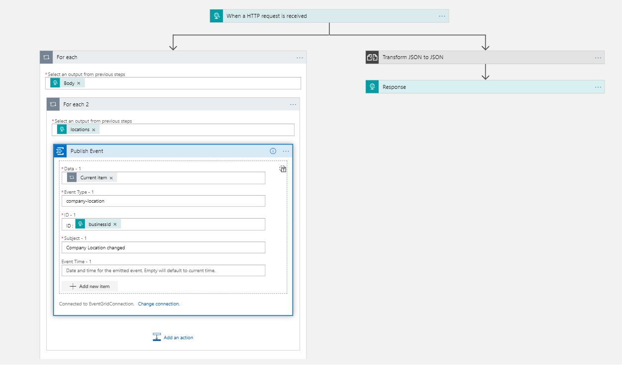 我使用触发器“当接收到HTTP请求时”,然后使用“发布事件”操作将多个事件发布到事件网格。For循环可以很好地拆分获得并创建要发布的事件的JSON,但是发布仍然会失败。