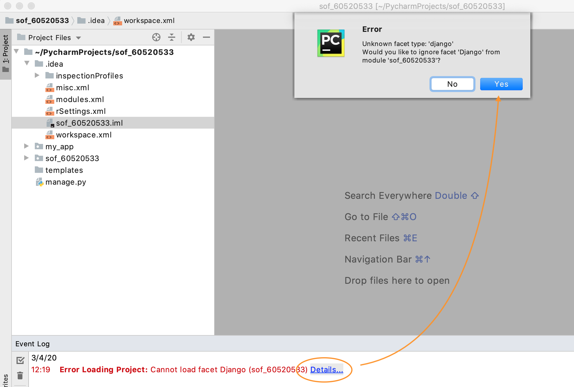 点击“细节.”在警告弹出中,对忽略<facet type="django" name="Django">节点或手动删除存储在项目根目录中的.idea/<project_name>.iml节点及其所有子节点的建议回答为“是”。