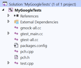gtest_main.cc添加到项目中。应该在..\packages\gmock.1.10.0\lib\native\src\gtest\src\里此时,项目应该如下所示(如果没有,尝试卸载并重新加载项目):