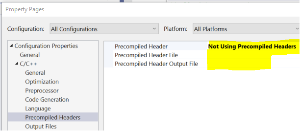 最后的配置步骤是禁用对三个Google .cc文件的预编译头的使用(重要的是:注意空字段)。