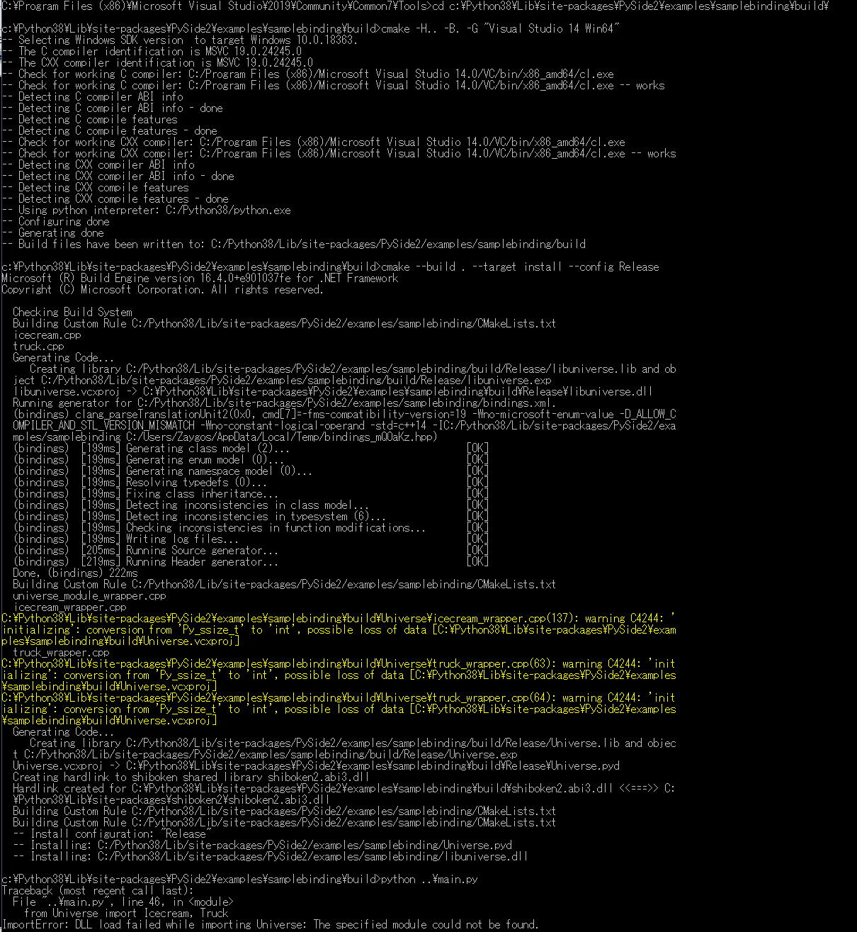 试图使样本绑定示例正常工作,但是无论使用编译器、python还是pyside版本,我仍然可以