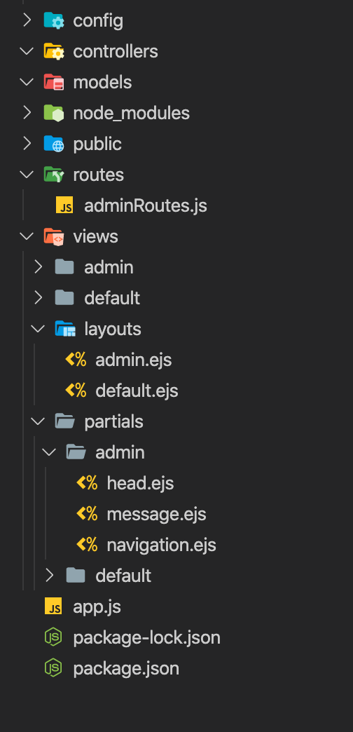 我想将我的外包.ejs文件实现到布局/admin.ejs方向。但它会抛出这个错误。我要我的外包页眉,页脚和肚脐显示。所有这些文件都存储在/views/partials/admin/filename.ejs中。