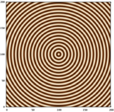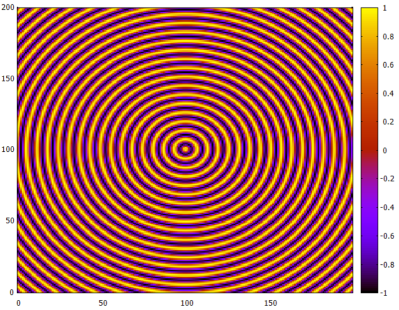 pdl> gplot(with => 'image', sin(rvals(200,200)+1) );然而,生成的地块与PDL书中给出的图不同,因为它包含额外的"V“形蓝色条纹: