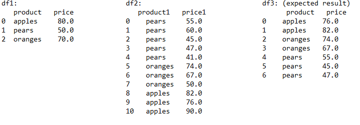 我有两个大的数据帧和相同产品的价格。它们的数据帧有不同的大小。第一数据帧df1,每个产品有一个价格,第二数据帧df2,每个产品有多个价格。我需要从df1获得产品和价格,并在df2中找到相应的价格范围(-5.0 < df1 < 5.0)。然后将其提取到第三个数据帧df3中。