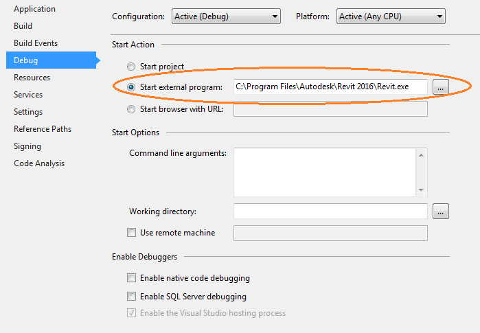 在开始调试外接程序时,可以告诉Visual启动Revit程序: