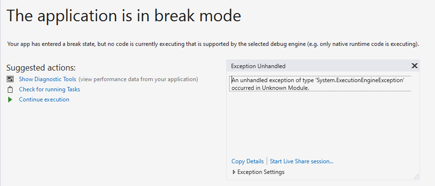 类型'System.ExecutionEngineException‘的未处理异常发生在未知模块.中。