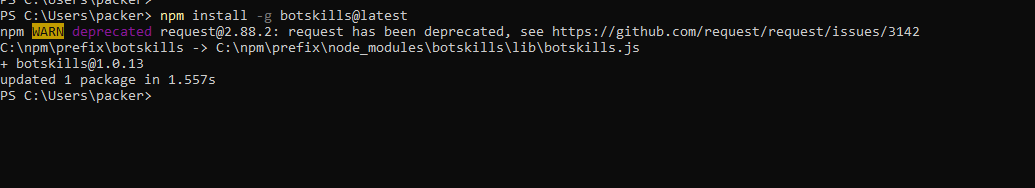 npm install botskills@latest -g --prefix C:\custompath\npm