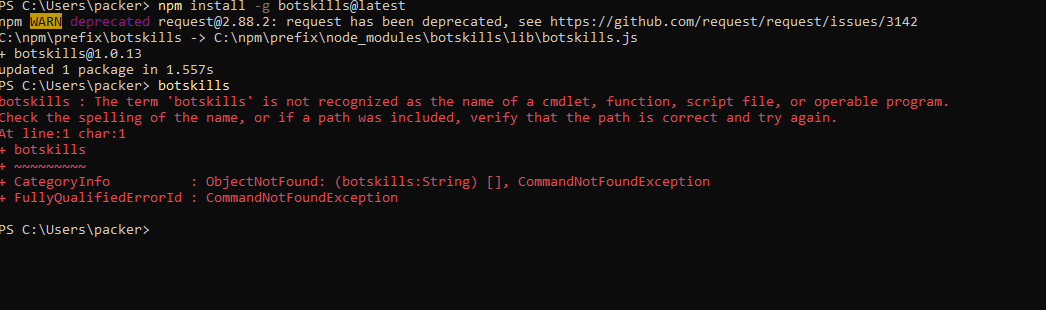 如果在path变量中没有npm路径,则需要进行某种补救。如果它在那里,那么您需要验证是否存在botskills.ps1。