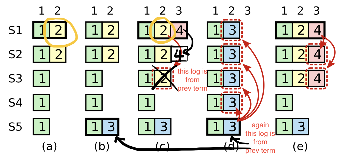 在“寻找可理解的协商一致算法”的论文中,图8显示了(d)和(e)中的一个问题,即一些旧日志可能被覆盖,永远不会返回。