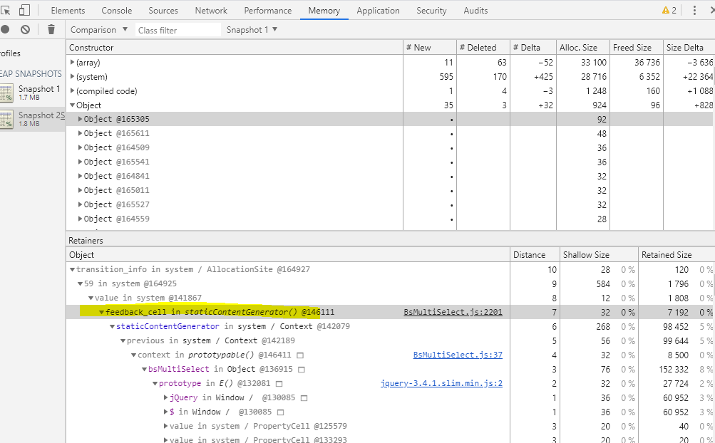 测试Chrome DevTools中的内存泄漏(经过几次附加/分离jQuery插件之后),我发现有一些增量对象,但我无法理解它们的本质: