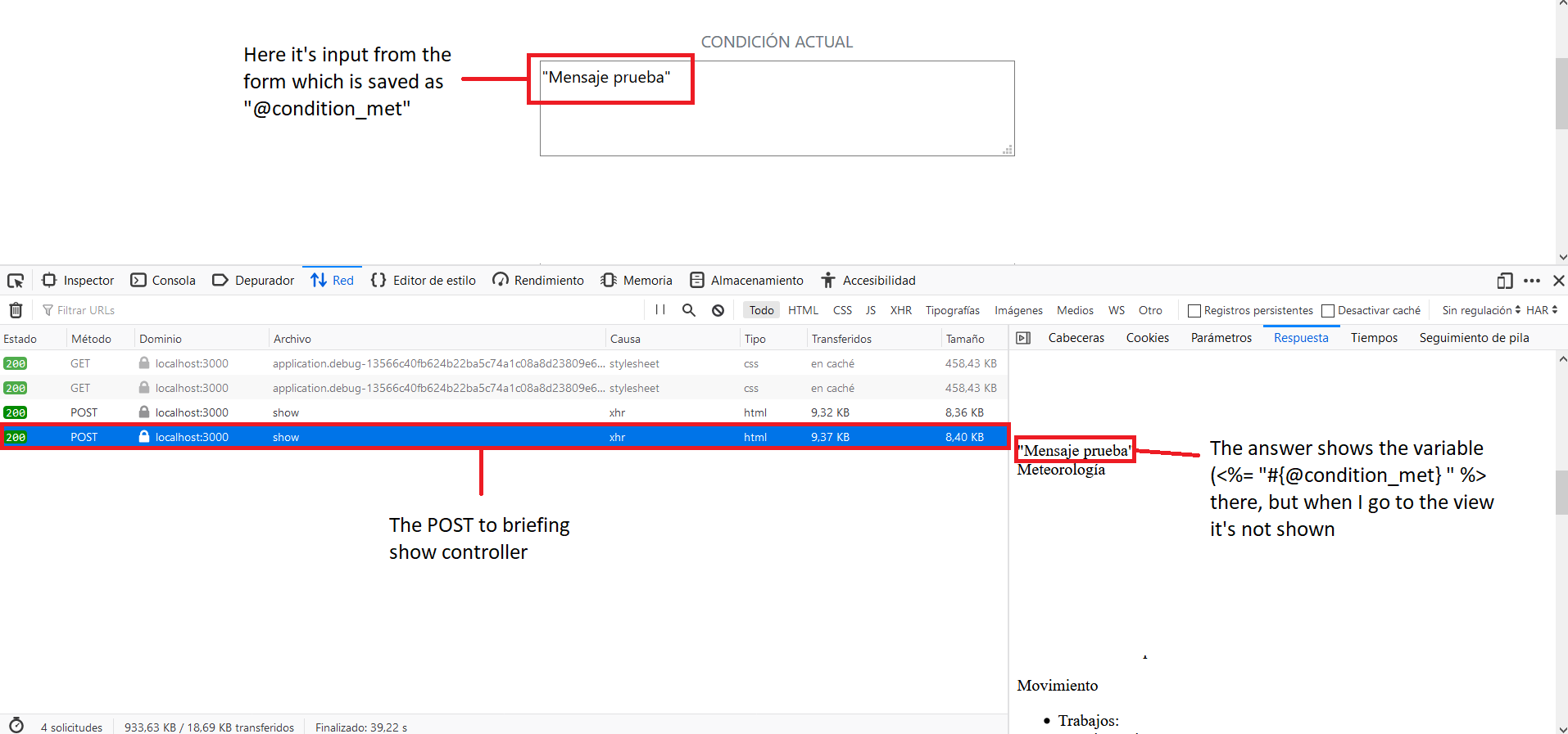 post "briefing/show", to:"briefing#show"我使用了浏览器检查器,并且我看到,当生成POST时,检查器在答案中显示变量,但是当我转到视图页面时,它没有显示: