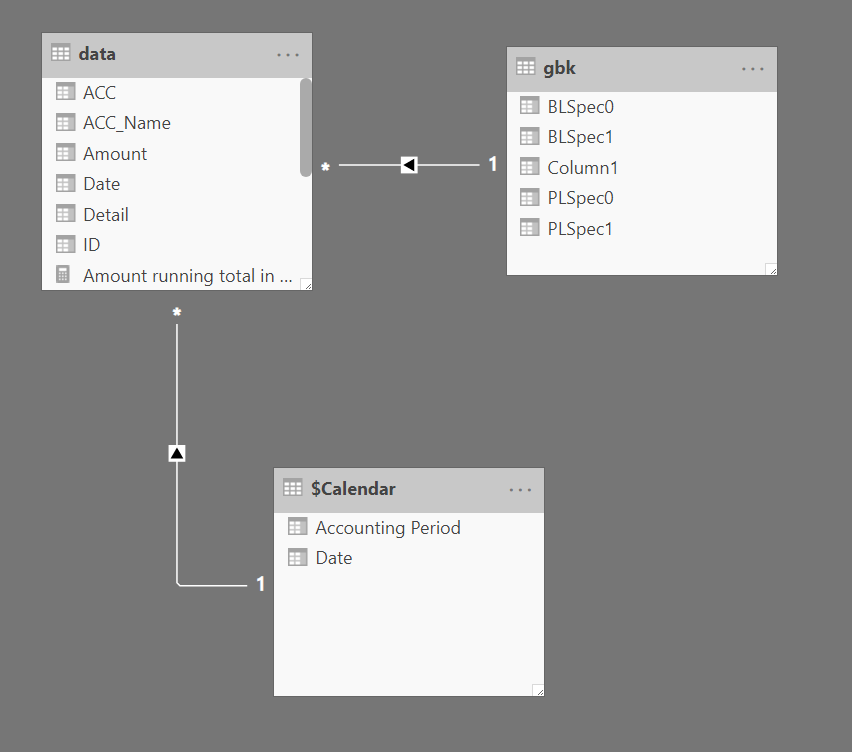 背景我正在尝试基于一个事务文件在Power中构建一个资产负债表。我的报告有一个交易表,其中包含经典的会计交易(帐号、金额、描述、日期等)、分配表,将账户分配给资产负债表、损益表或现金流层次结构(账户、PLlvl1、PLlvl2等)。还有日历表。