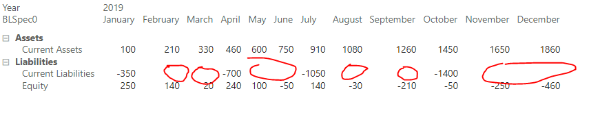 在这个简化的例子中,我想要的结果是空白处结转上一段时间的值,-350也显示在二月和三月,-700在五月和六月等等,但是我似乎想不出一个正确的方法。