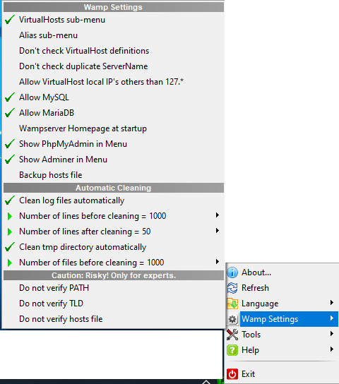 要删除您不想要的菜单(稍后可以很容易地将其添加回来),只需使用以下WAMPSevrer菜单