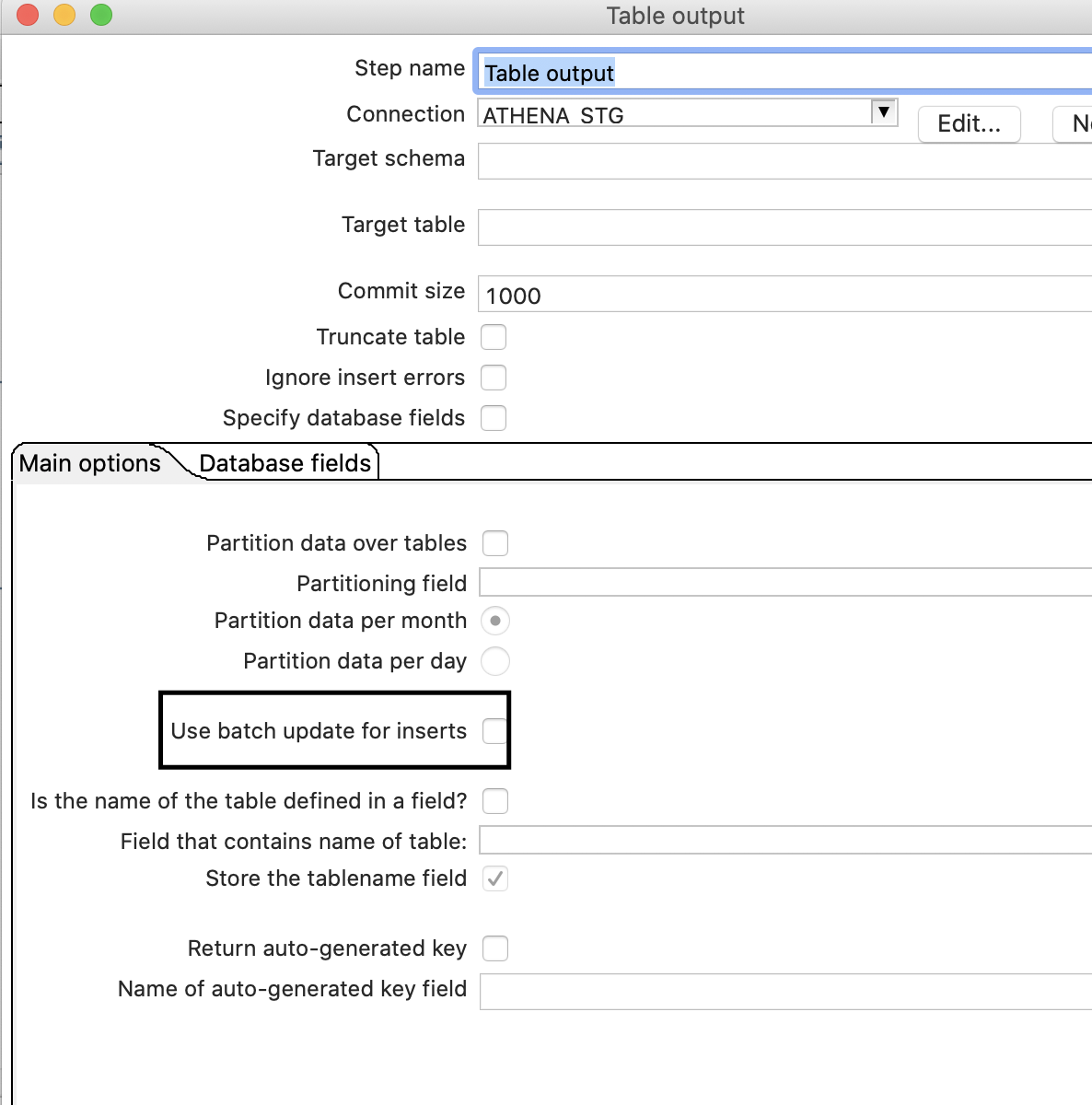 在表输出中,必须取消选中use batch update for insert
