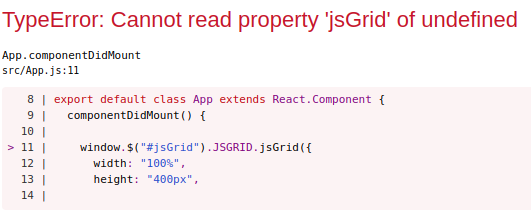 我对jsgrid库有意见。我试着加载它来对项目做出反应。我包括了要进行项目的库,如npmjs上的说明。