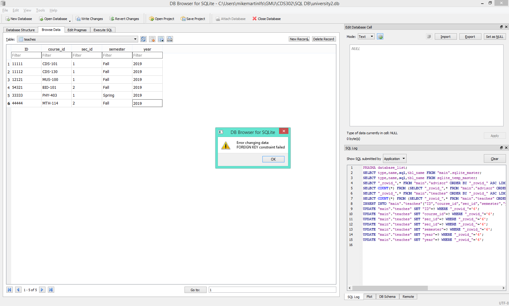 INSERT INTO teaches VALUES ('44444', 'MAT-114', '2', 'Fall', 2019);错误发生在最后一行。我总是得到: