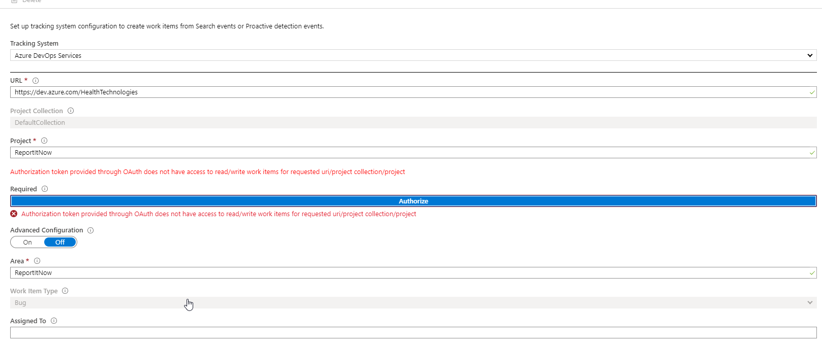 所以在Azure工作项部分,我把https://dev.azure.com/HealthTechnologies/放在URL,在项目中我放ReportItNow,我不知道我做错了什么。