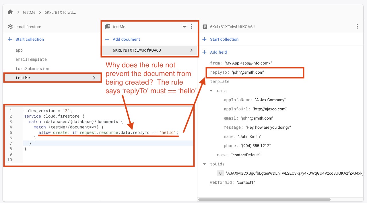规则编写规则allow create: if request.resource.data.replyTo == "hello";是为了防止任何文档被创建,除非'replyTo‘== "hello“。