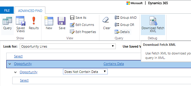 您需要创建一个FetchXML查询来获取机会线项--您可以使用Advanced创建该查询。这看起来有点奇怪,因为您使用子记录创建查询并链接回父机会,但这是Kaskela将结果过滤到与机会相关的机会行的方法。