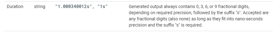 关于如何在JSON文件中表示持续时间的Google协议缓冲区的文档非常具体:工期应表示为带有后缀s的字符串,持续时间为0、3、6或9个小数秒: