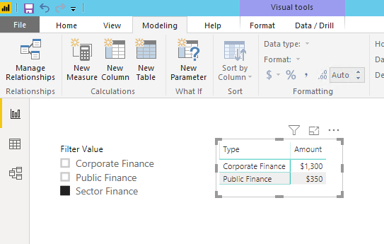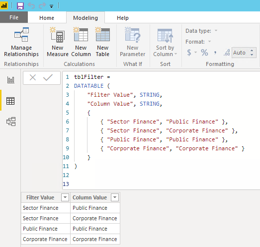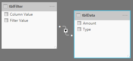 然后创建一个方向,多到多个关系:tblFilter[Column Value] -----> tblData[Type]