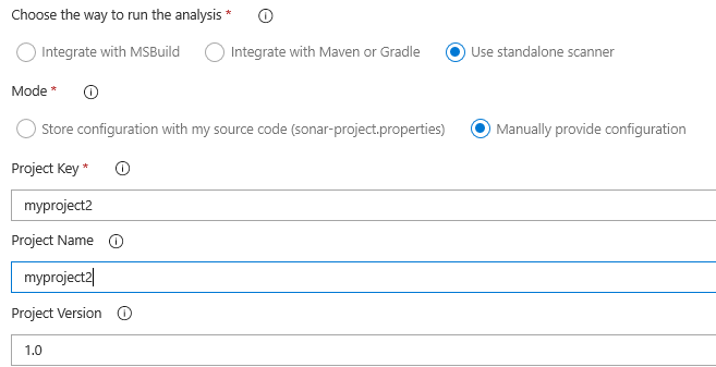 在准备分析配置任务中,我选择使用独立扫描程序,而模式是手动提供配置。我设置了变量sonar.cs.opencover.reportsPaths="$(Agent.TempDirectory)/coverage.opencover.xml"。