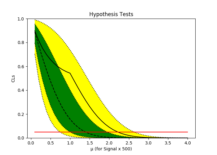 信号需要缩放的值可以通过尝试几个缩放因子值来确定,直到mu=1的信号强度的CLs值开始看起来合理(比1e-3更大的值)。在这个特殊的例子中,500的比例因子似乎没问题。