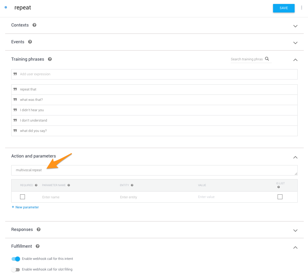 您所需要做的就是提供一个意图,在对话框流UI中将其"Action“设置为"multivocal.repeat”,并启用web钩子。所以像这样的东西会起作用: