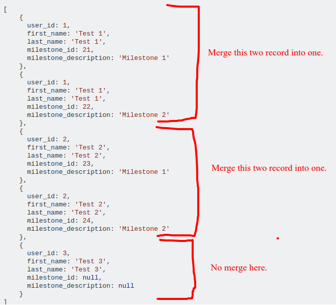 ]在这里,我有一些用户有多个里程碑相关联,而有些用户没有里程碑。如果有关联的里程碑,我想将里程碑合并成子数组。