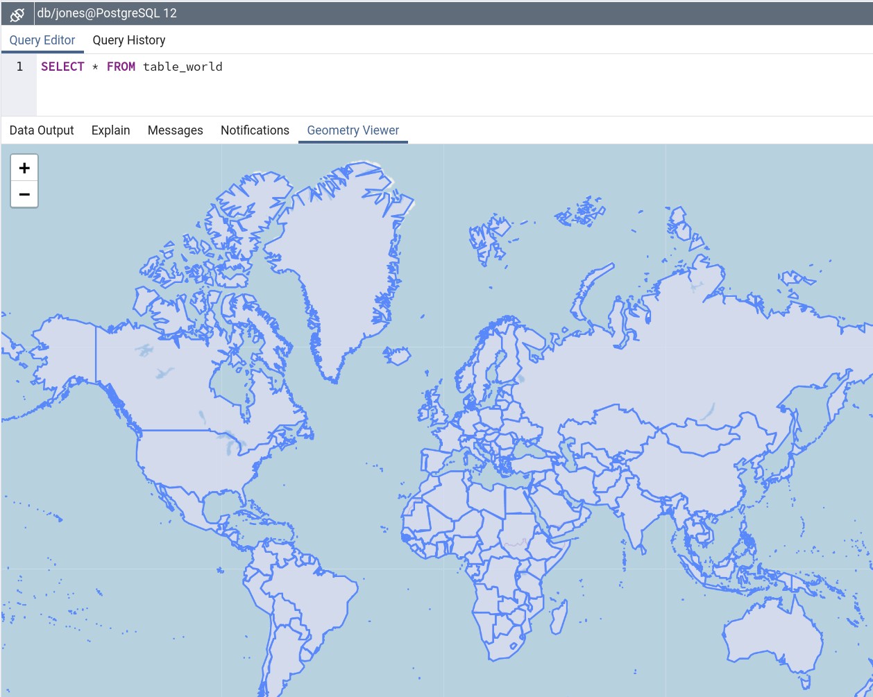table_world是目标表的名称。psql -d mydb考虑到当前操作系统用户在数据库中有一个帐户,不需要密码,数据库安装在本地主机上,并且在标准端口5432上监听。检查psql文档以构建您自己的连接命令,例如,psql -U myuser -h 192.168.1.42 -p 5434 -d mydb可以在远程PostgreSQL at 192.168.1.42中的数据库mydb中使用用户myuser登录,后者在端口5434上侦听。如果您的PostgreSQL未配置为接受连接,请检查此answer。4326是WGS84的标识符,它是这个shapefile的空间参考系统,也是世界上最常用的。。。你的数据已经准备好了。来自geometry viewer of pgAdmin4的截图: