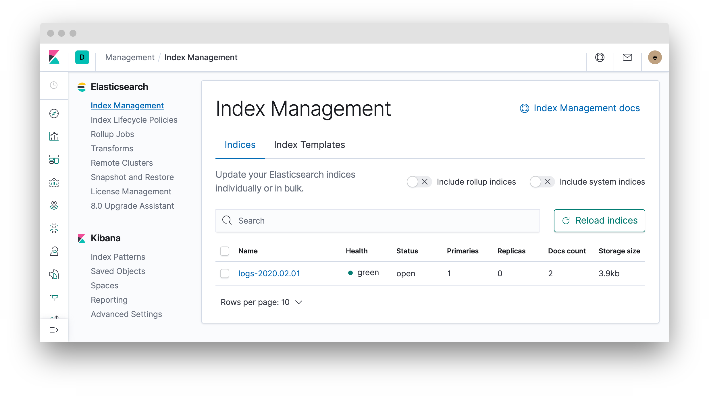 要查看日志-*索引中的文档,需要打开发现(Kibana中左侧边栏的第一个图标)并选择已经设置的索引模式。这是在Kibana搜索应用程序数据的适当方法。