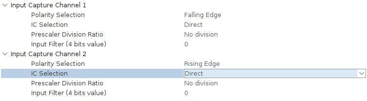 如果在默认情况下将所有内容保留在TIM配置中,则可以选择“组合通道”到"PWM输入“模式,这将自动设置所有内容。然而,这和@Tagli的截图节目是一样的。