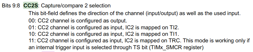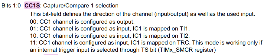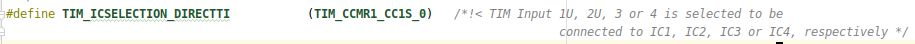 我试图设置脉宽调制输入在STM32F302R8上,以计算频率和占空比。在STM32F302x8参考手册中,它指出我们需要将IC1映射到TI1 (CC1S = 01),并将IC2映射到TI1。