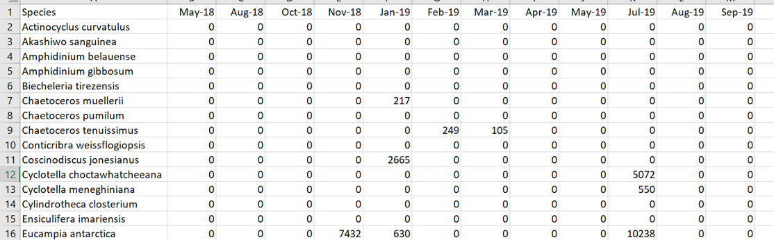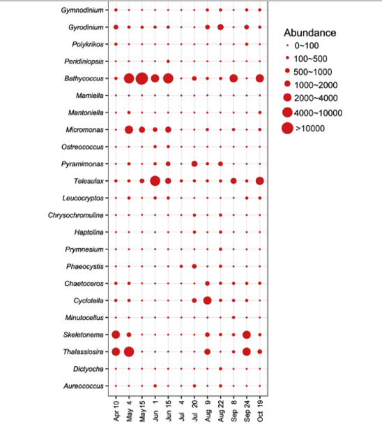 我有一张桌子,里面有不同月份丰富的物种。我想要制作一个气泡图,其中y轴代表丰富物种,x轴代表月份,而泡沫半径是我在这个月发现的物种丰度。