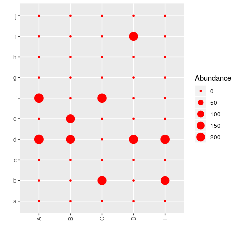 下面是用模拟数据集创建的气泡图。我试图展示如何用类似于问题中的数据集的结构来绘制数据集,而且像往常一样,这类问题是一个数据重整问题。见reshaping data.frame from wide to long format。在这种情况下,我必须首先将行名作为新列。只有到那时,数据才被重新调整。