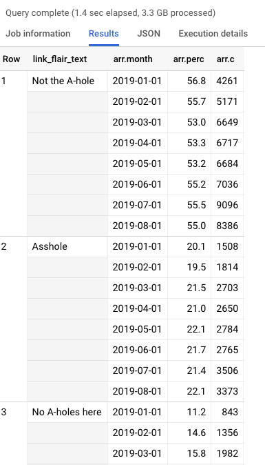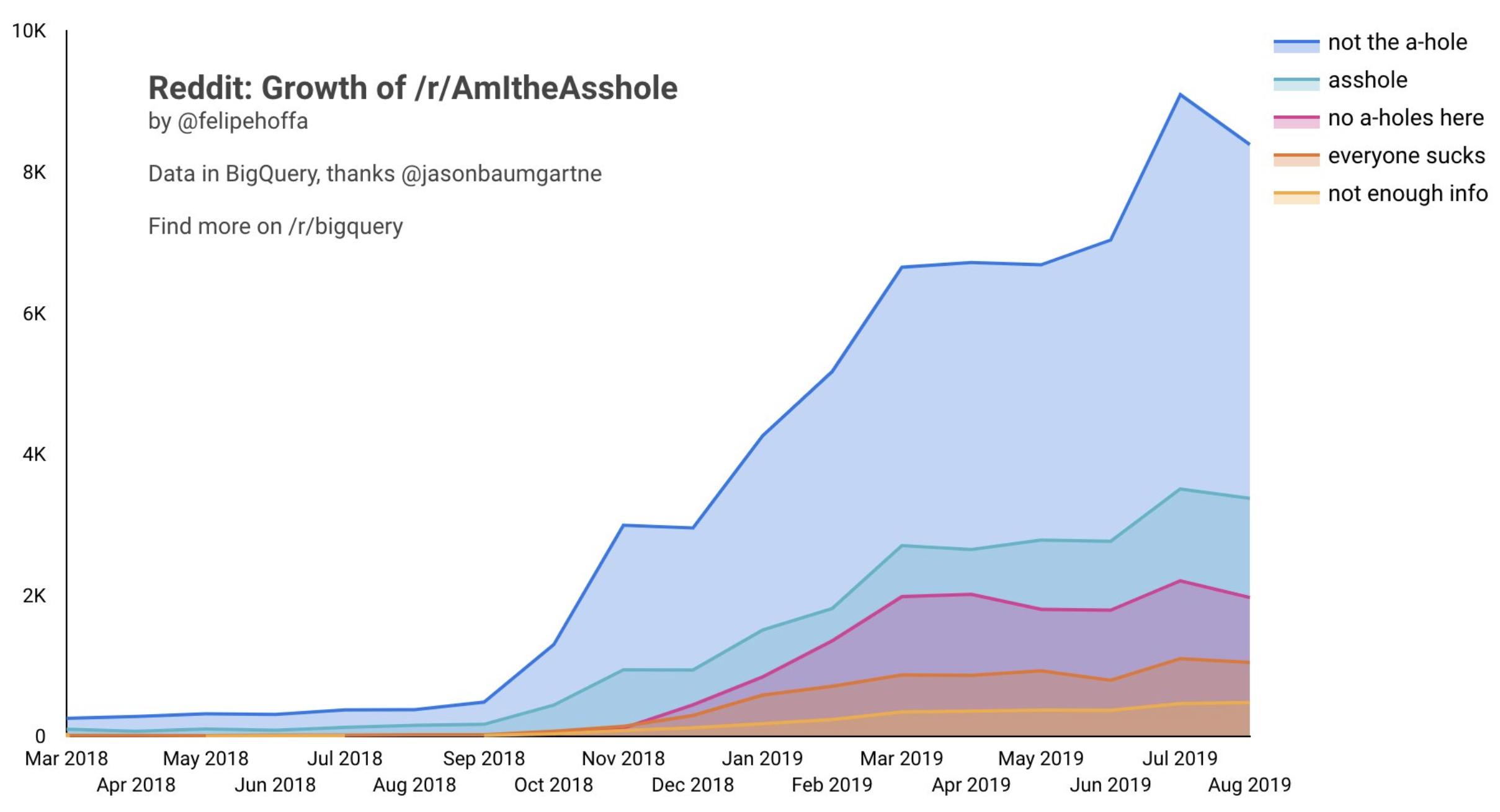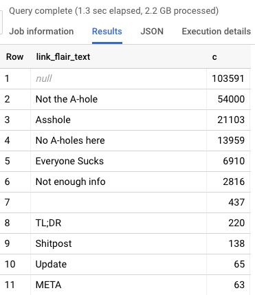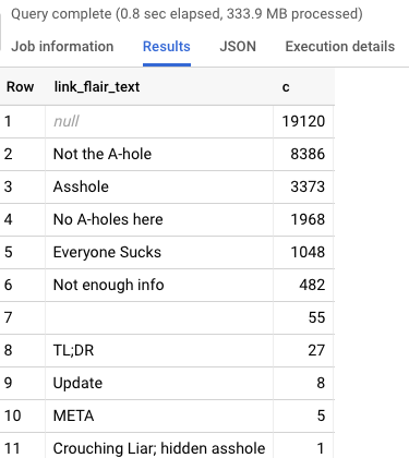 这样的查询就可以了--这个查询将得到/r/AmITheAsshole上的帖子数,按照大多数典型的判断顺序排列: